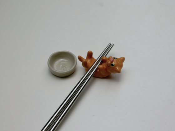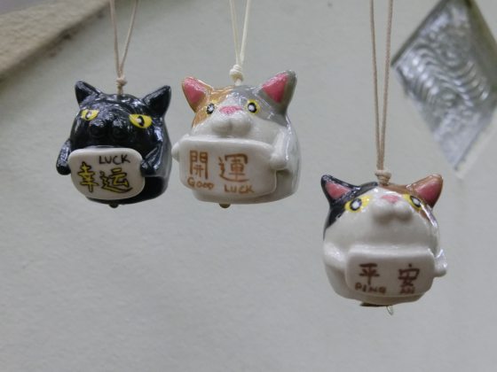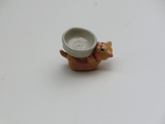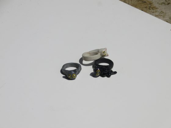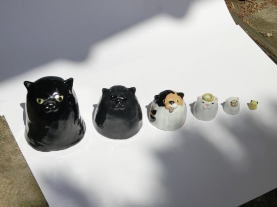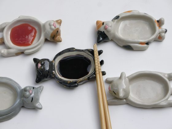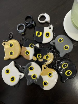 其余的陶器,大多是能使用的物件,如同时放筷子的酱油碟,翘起的猫尾巴放筷子,猫肚皮凹槽之处盛酱油,其他的小物件包括扑满、胸针、戒指、挂件……她认为有使用价值的比较实际,就像饲养猫的人任何时候都想把自家的猫咪随身携带在旁,但是,要能使用需要考量的因素就更多,也得更周全,像戒指,顾客向她反馈说一不小心掉在地上指环就轻易破碎,指环又不能做得太厚,太粗,不雅观是其次,配戴起来过重也不舒服,于是,她想方设法改良。毕竟,有使用价值,也要耐用,才符合实际。