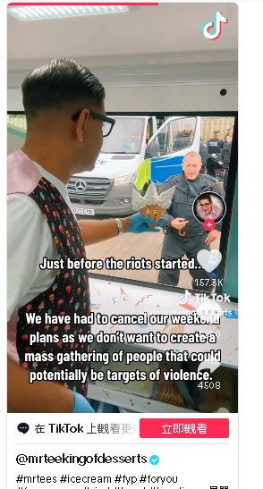 英穆斯林网红送冰淇淋 感谢警力抗反移民暴动