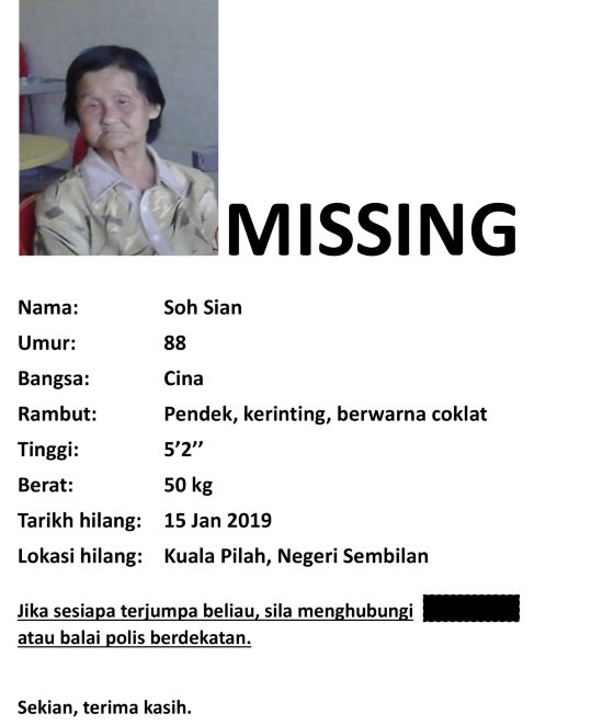 那是因为,婆婆在5年前的农历新年前失联。那年的我还在砂州某家医院值班。那天的早晨,接到了爸爸的来电,让我顿时六神无主。电话中爸爸急速又简洁地告知,婆婆从昨天傍晚出门后就没回家。叔叔和姑姑们即刻离开各自的岗位,回乡出一分力。我也向院长申请特假加入搜寻团队。我们除了在报章上刊登寻人启事,乡亲也号召大众到处寻找,希望尽快寻获走失的婆婆。有些热心人士提供赏金,有些人则请大师做法事。大家齐心协力,不放过任何一丝寻获的希望。