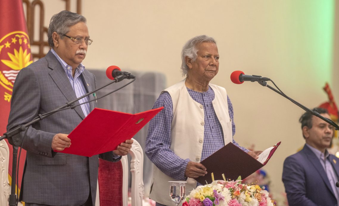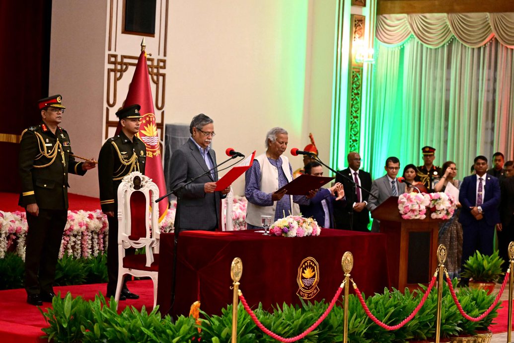 尤努斯在首都达卡的总统府宣誓就职,与会者包括政坛及公民社会领袖、军事将领及外交官员。