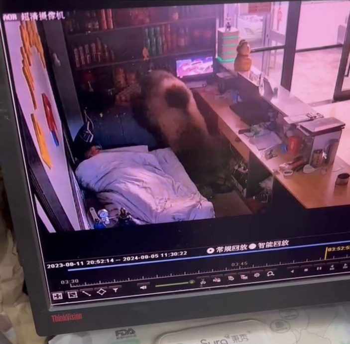 棕熊半夜闯入酒店觅食 男子被惊醒后淡定离开