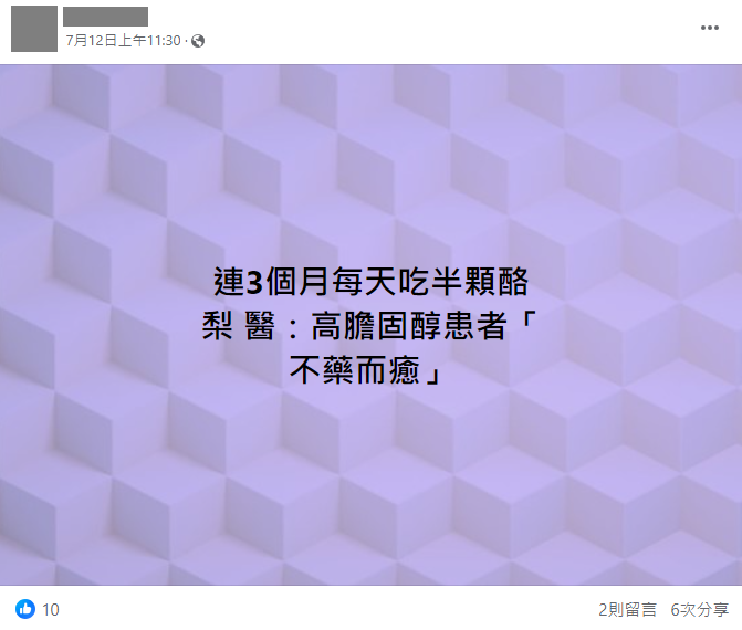 根据台湾事实查核中心网站报道,社交和通讯媒体近期流传以上内容,并指相关说法来自医生;但台湾振兴医院心脏科主治医生陈冠群表示,虽然过去已有许多营养学家和专家都有研究非药物可达到降低胆固醇的效果,惟不宜擅自用食物取代药物。