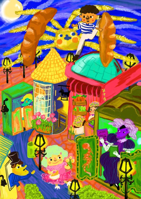 抵达“巴黎”市区已是午夜12点后,天空是种梦幻的靛蓝,街上居然还有很多店还在营业。我经过一间烘焙坊,里面做的面包全都是蔬菜造型,也经过路上奇妙的角落小空间,每个角落都设置一间小房,里面放置了历史人物的雕像,他们穿着爱德华时代的贵族服装,发出萤光紫和萤光绿的诡异光芒。