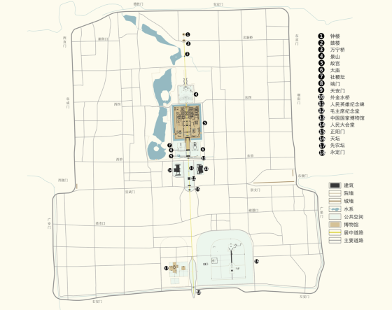 这条北京中轴线由北向南,依次经过钟鼓楼、万宁桥、景山、故宫、太庙、社稷坛、端门、天安门、正阳门、天坛、先农坛到永定门,共15处遗迹一起被列入世界遗产,堪称中国都城秩序最理想的杰作。