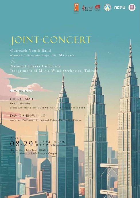 USCI大学将于8月29日,举行台湾嘉义大学管乐团演出。嘉义大学管乐团日前来马进行为期30天的考察之旅。一行20余位成员是在助理教授林士伟的带领下前来,除了与国内各校的铜乐队展开为数20场的音乐演奏,还与现场听众热切交流。