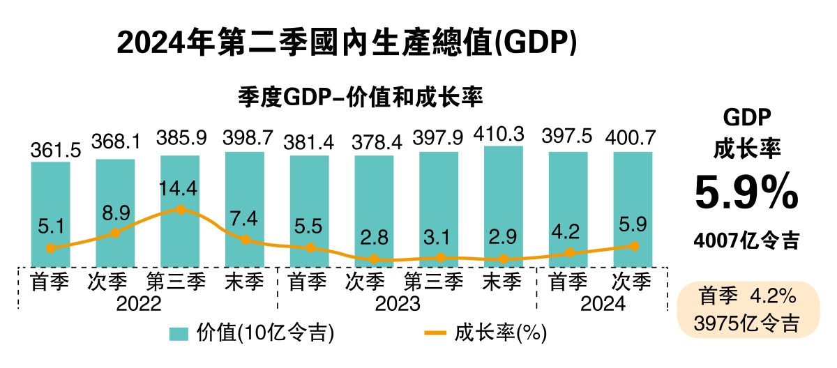 (吉隆坡16日讯)国家银行公布,大马2024年第二季国内生产总值(GDP)按年增长5.9%,是2022年第四季以来最高增速,由国内需求尤其是私人支出增多及出口进一步复苏所推动。