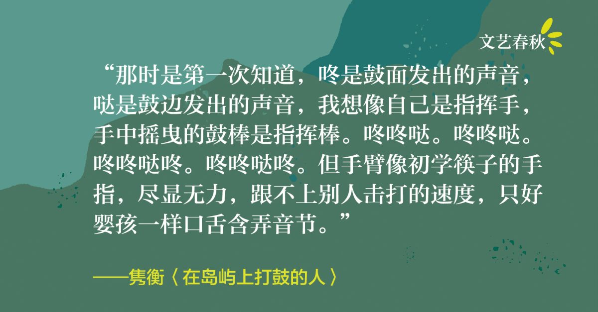 大脑懂得自我修复,用发泡棉去填补伤心的缺口,一如毕业后,各种大小事物被用来填满日子的隙罅,不让我走路的时候绊倒。大学生活已然是上辈子的事,让我曾经在某个无法入睡的夜里很认真地接受现实,长大后的日子是割舍,青春从成熟脱离,不羁被稳重流放,就像鱼与熊掌,不是我能就全都要。但有时候忙完工作,回到城市里逼近天际的公寓,倚在阳台的栏杆看冒出的星点,总会无来由地想起很久很久以前,将那座北陲小岛住成一个异国的大学生活。那段时间玻璃景盆植物一样封闭在透明容器里,外头的阳光明媚耀目,课堂一结束,我就狂骑脚踏车躲进涵洞般的宿舍,拥抱宿舍和床褥。窗外蒲公英一样飘过的谈笑声,箭艺社的人踩踏绿油油的草地练习箭艺,楼上楼下波浪一样的人们哗啦啦流过来流过去,只剩宿舍里天花底下无灯的空间和自己,这样的生活日复一日地过,像是深海里的避光物种。直到有一天,涵洞外传来闷闷的轰隆声响,震落满地褐叶和黄花碎瓣,我循声沿路走去,来到日光底下一处打鼓的人群,接过递来的一双鼓棒,要我模仿他们的动作,于是我抓紧鼓棒打,学这些人,对着大鼓一番挥打。