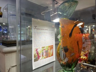 除了一般的装饰品,他在作品中融入本地元素。在玻璃橱柜里,摆放着一座以猪笼草为形的水晶玻璃。在灯光照耀下,玻璃身反射出光,乍看之下栩栩如生。此外,他还制作了大马水底生物,例如蛤蜊、贝壳、热带鱼,让外国游客离开前,能带走属于浮罗交怡、属于马来西亚的记忆。