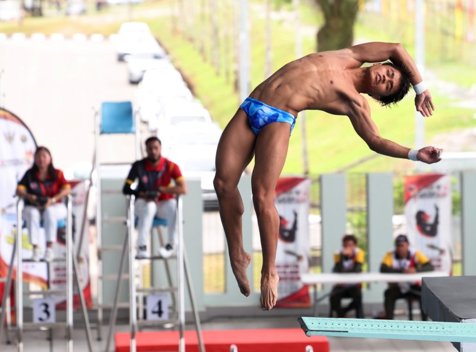 来自砂拉越的埃维斯‧普里斯特利(Elvis Priestly),周一在2024年砂拉越马运会跳水赛的男子3公尺跳板,展现了令人惊叹的跳水技术。