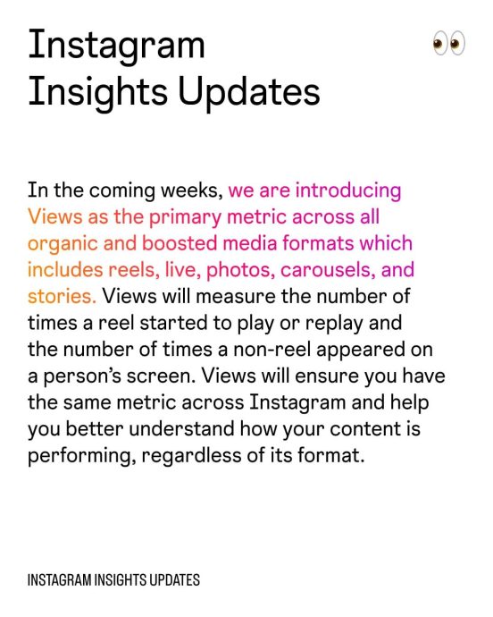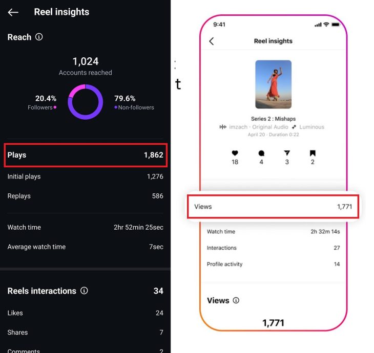 Reels一直是IG重点推广的贴文形式,而“Views”将会取代“Plays”。它会计算Reels的播放次数、重播次数;而至于非Reels的贴文,过往是用“Impressions”(展示次数)来评估贴文的成效。现在有了“Views”,IG会取消“Impressions”的功能。