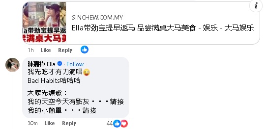 在星洲日报分享新闻链接到脸书之后,竟然意外发现Ella本尊留言回应:“我先吃才有力氣唱,Bad Habits哈哈哈!大家先練歌:我的天空今天有點灰。。。請接!我的小簡單。。。請接”,她不只为自己的新专辑《BAD HABITS》打广告,还预告周六演唱会会选唱S.H.E的《天灰》和新歌《小简单》,粉丝们赶快把歌练熟吧!