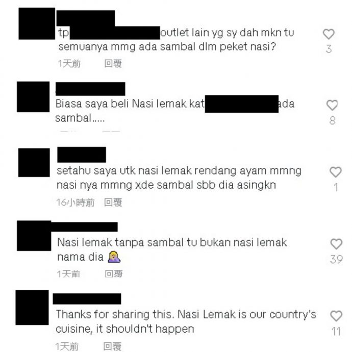 然而,有网民认为可能是店员忘了放,因为本身曾在该餐饮店其他分行购买椰浆饭,都有包含参峇,因此对于占扎尼的分享感到惊讶。