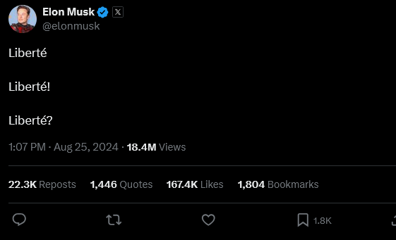 消息一出,平台X行政总裁、特斯拉行政总裁马斯克连发多文讽刺欧洲没有言论自由,要求释放杜罗夫,并用法语写道:“自由。自由!自由?”