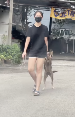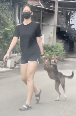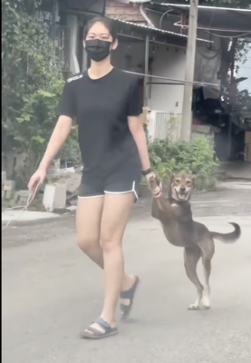 视频显示,女主人右手拿衣架,左手则捉住狗狗的两只前脚,狗狗只能用后脚屁颠屁颠地行走,但仍可轻松跟上主人的步伐,非常逗趣。