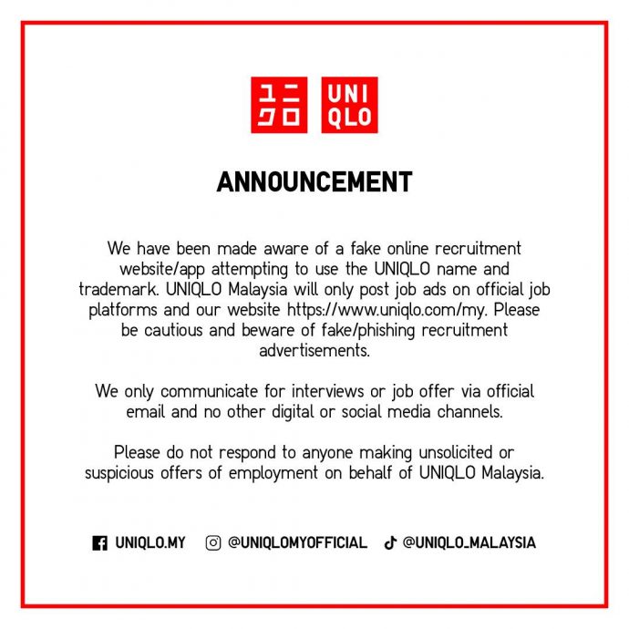 “马来西亚优衣库只会在官方招聘平台和官方网站上发布招聘广告,并仅通过官方电子邮件通知面试或工作机会,而非其他社交媒体渠道。”