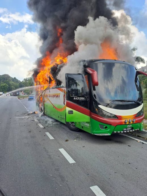 (八打灵再也29日讯)火烧观光巴士,所幸没有造成伤亡,惟巴士被大火烧成废铁!