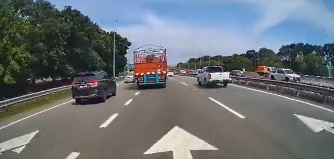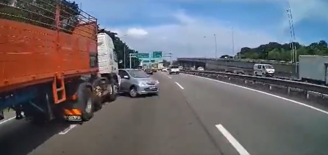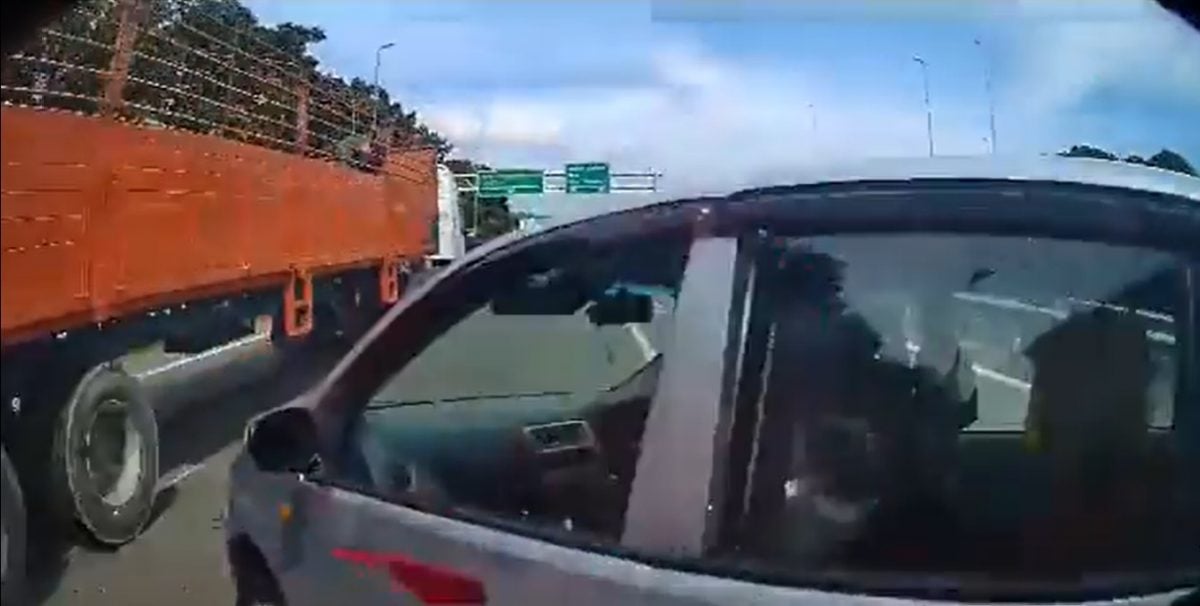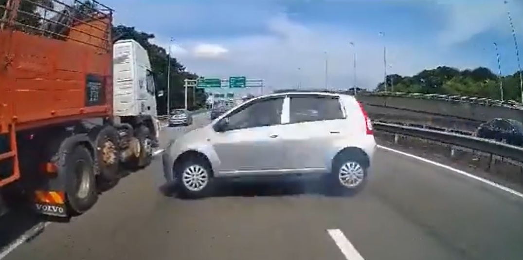 视频中,一辆大型罗里在中间车道行驶,突然要驶入左边车道,却疑似没发现到左前侧的一辆Viva,结果造成严重撞击。