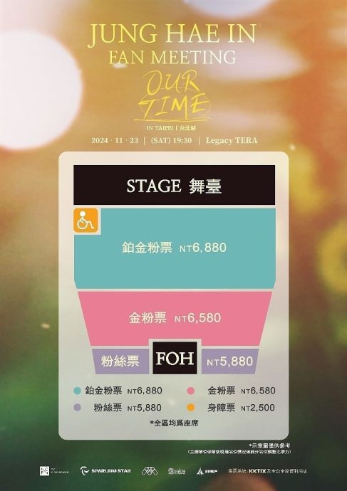 经纪公司近期宣布,丁海寅将展开《JUNG HAE IN FAN MEETING OUR TIME》巡回粉丝见面会,将陆续到泰国、首尔、雅加达、马尼拉等地和粉丝见面。台湾见面会票价曝光,依照座位分为最贵铂金票价6880元(约930令吉)、之后陆续为6580元(约890令吉)金粉票和5880元(约795令吉)粉丝票。要看男神一面,最少要花费6000元(约812令吉),让不少人直呼吃不消。