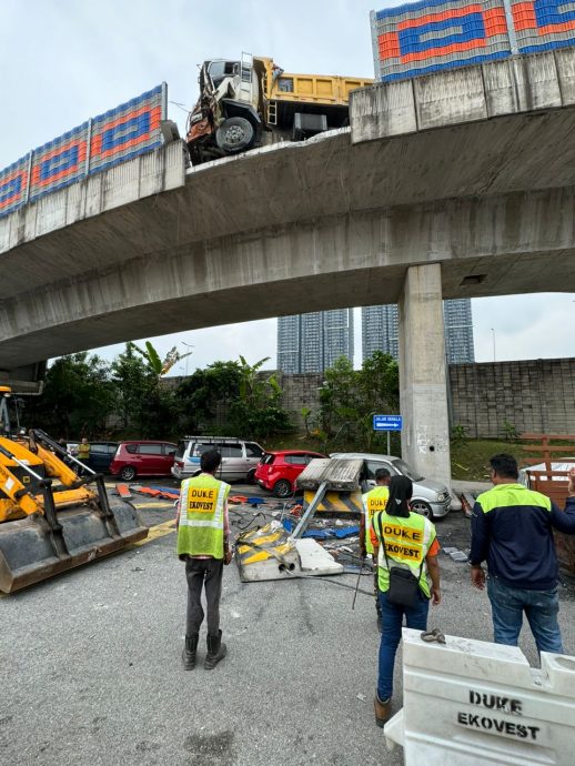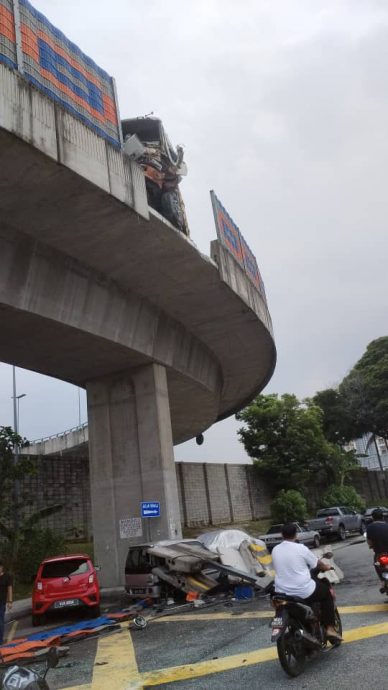 (吉隆坡6日讯)一辆砂石罗里今早途经大使路-淡江大道(DUKE)一处高架天桥时,疑因失控撞破防护墙,护墙石块更是从空中坠落地面,砸中一辆停泊在下方的轿车,险象环生。