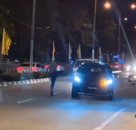 视频所见,一名裸露上身的男子站在北海斗母宫前路段(拉惹乌达路),不断朝着路过的轿车用脚踹攻击。