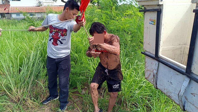(芭堤雅7日综合电)泰国春武里府一名男子晚上骑摩托车回家途中,在路边停车小便,却不小心掉进一个8公尺深的废弃井中,高声求救了一整夜都没人路过。幸好翌日上午一名女村民路过,听到有人呼救,才找人把他救了起来。
