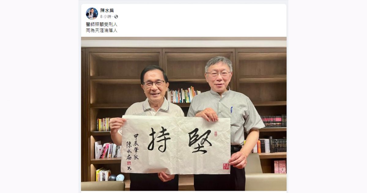 陈水扁日前在柯文哲“无保请回”时,曾喊话“不要忘了16年前,我2次无保饬回”,如今再发文,照片中,陈水扁用书法书写“坚持”两字赠予柯文哲,下款时间是“甲辰肇秋”,即今年农历七月间,显示二人很近期会面留影。陈水扁同时也在帖文写下“医师照顾受刑人,同为天涯沦落人”14字,背后含意耐人寻味。
