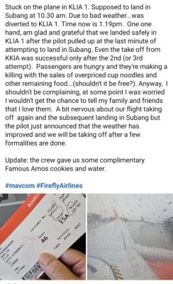 据乘客在脸书贴文,这趟从亚庇国际机场起飞的班机,航班编号为FY2553,原定在早上10时30分降落在梳邦机场,但却因恶劣天气而被逼转飞吉隆坡国际机场。
