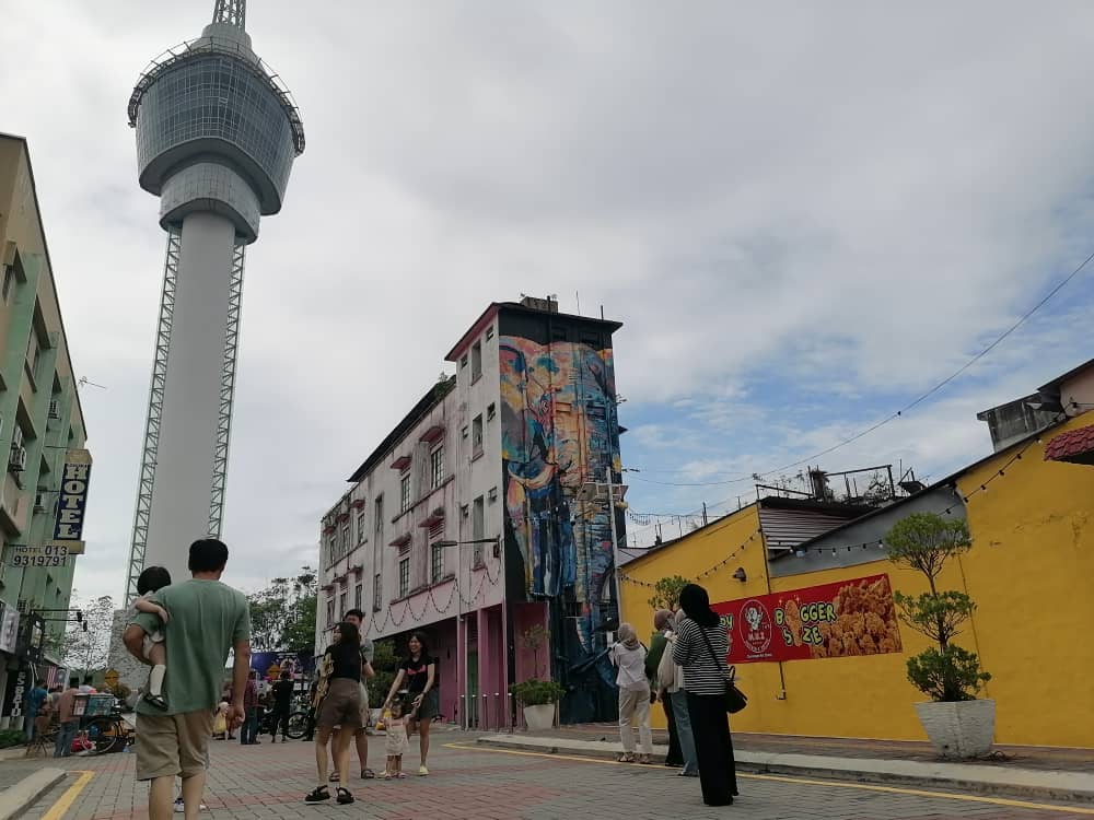 图为旅客们于周日一早在壁画街,与关丹188塔来张合照。