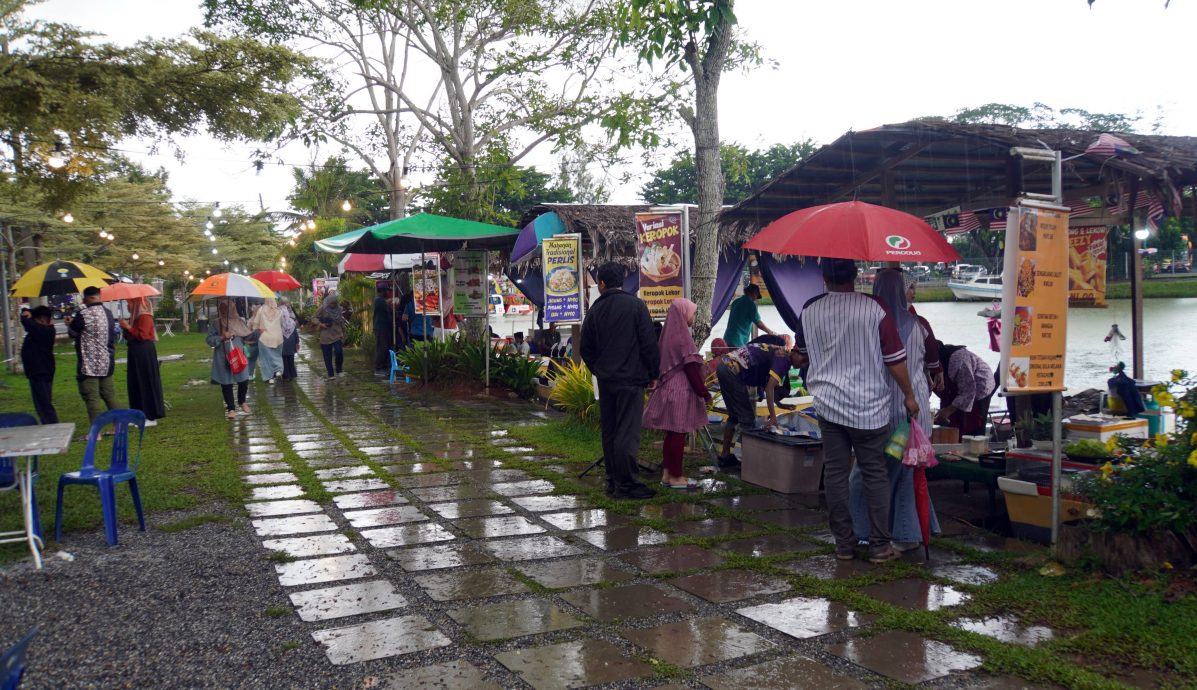 惟这2天碰上时阵雨,影响人流量,玻州水利灌溉局的水上市集虽人潮不少,但因时阵雨,游客只能撑伞逛市集,冒雨享用美食,小湖泊的水上脚踏车则乏人问津。