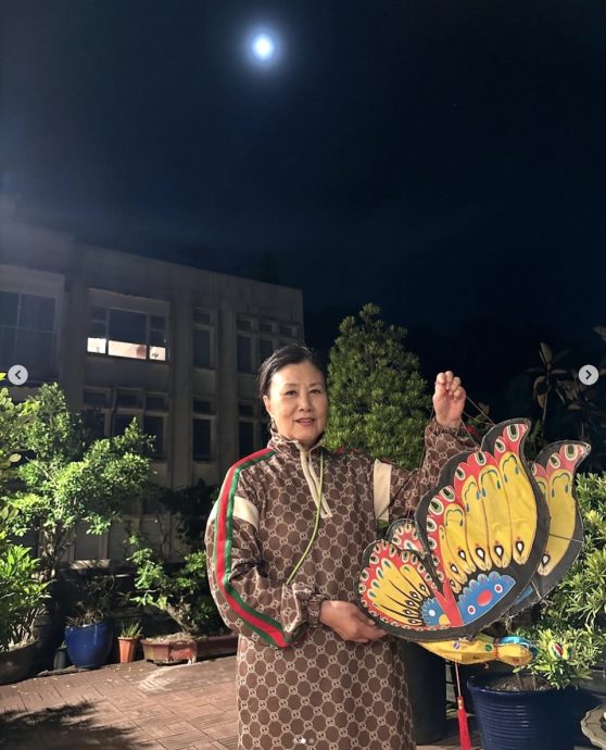 阿姐在家英哥陪伴下,在圆月下玩蝴蝶灯笼,恩爱又温馨;照片亦见她在家中阳台挂上灯笼,并可见到万家灯火的夜景。翻查资料,阿姐早在2021年已穿上该套GUCCI连身裙接受杂志访问,这条裙子并非新品,也见阿姐的长情和念旧。