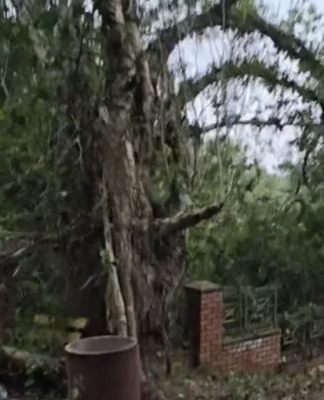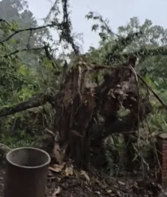 突然男子左侧传来木头断裂的声音,转头一看,惊见竟有一棵大树被狂风吹倒,所幸它倒向相反方向,没有砸到任何人。