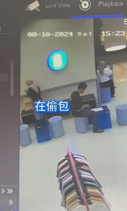 就在这个时候,同样站在档口前的一名巫裔女子,发现她正专注点咖啡时,就径直走向凳子,快速地把整袋衣服偷走。