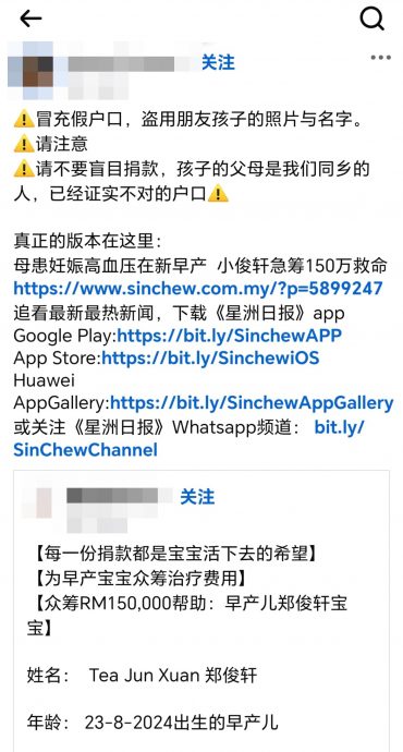 他指出,有关脸书的贴文盗用孙子照片,故事内容稍作修改,包括小孩父亲和小孩名字,只修改姓(江改成郑),筹款数目也更改(150万令吉改成15万令吉),且筹款的银行户头完全不一样。