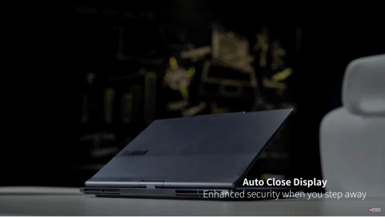 根据演示视频,该笔电具备了智能感应功能,当它检测到无人使用时,会自动把笔电合上,确保用户的隐私和数据安全。