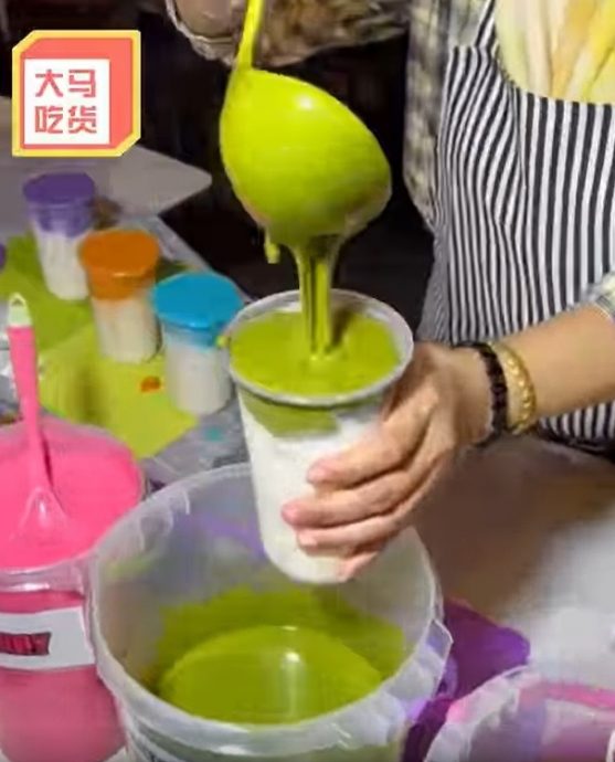 视频中,可见老板娘把杯子装满冰块和牛奶,接着加入非常浓稠的“果茶酱”,而相关“果茶酱”的颜色鲜艳程度,更是让人看了直呼“可怕!”。
