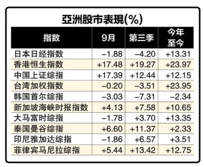 总结全月,表现最佳的是香港恒生指数,共暴涨17.48%,接下来是上海综指共涨17.39%;韩国股市表现最差,跌3.03%。