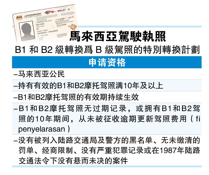 (加影1日讯)拥有10年驾龄且符合特定条件的B1和B2级摩托驾照持有人,即日起可在全马180所驾驶学院申请转换为B级驾照,该特别转换计划的顶价为160令吉。
