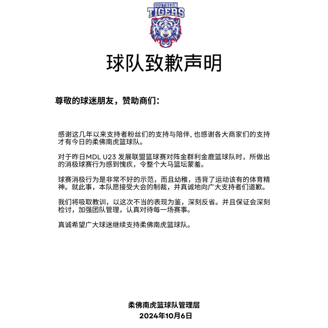 另一方面,南虎随后也发球队致歉声明,提到己队感到愧疚,令整个大马篮坛蒙羞,并保证会深刻检讨与反省。