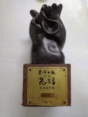 那些年,非常热爱写作,在创作投稿之余,也经常参加征文比赛,借此磨砺文笔。《星洲日报》在1990年举办第一届花踪文学奖,我当然也不会错过,于是废寝忘食写了短篇小说、散文和新诗各一篇投寄出去。虽然不敢抱太高的期望,不过竟然意外以〈漫漫长路〉获得了散文佳作奖,并在天后宫礼堂上台捧了一座沉甸甸的木雕花踪奖,当然乐不可支,兴奋了很长一段时间。