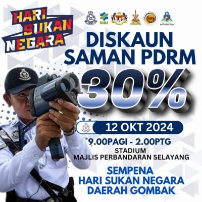 (八打灵再也11日讯)为配合国家运动日,鹅唛警方为民众提供高达30%的交通罚单折扣优惠,而民众仅限在5小时内前往士拉央市议会体育馆缴付罚单,才能享有相关优惠。