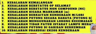“共有10种罚单类别不获此优惠,包括车祸罚单、安全行动罚单、无法享有折扣的罚单(Non Compound)、法庭审讯罚单、涉及重型罗里罚单、危险超车、滥用紧急车道、闯红灯、双线超车和非法改装排气管罚单。”