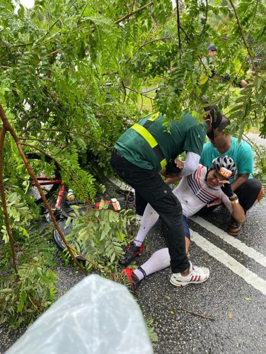 赛沙迪参加铁人赛事骑脚车时,不慎撞入倒塌的树木中受伤。(图取自社交媒体)