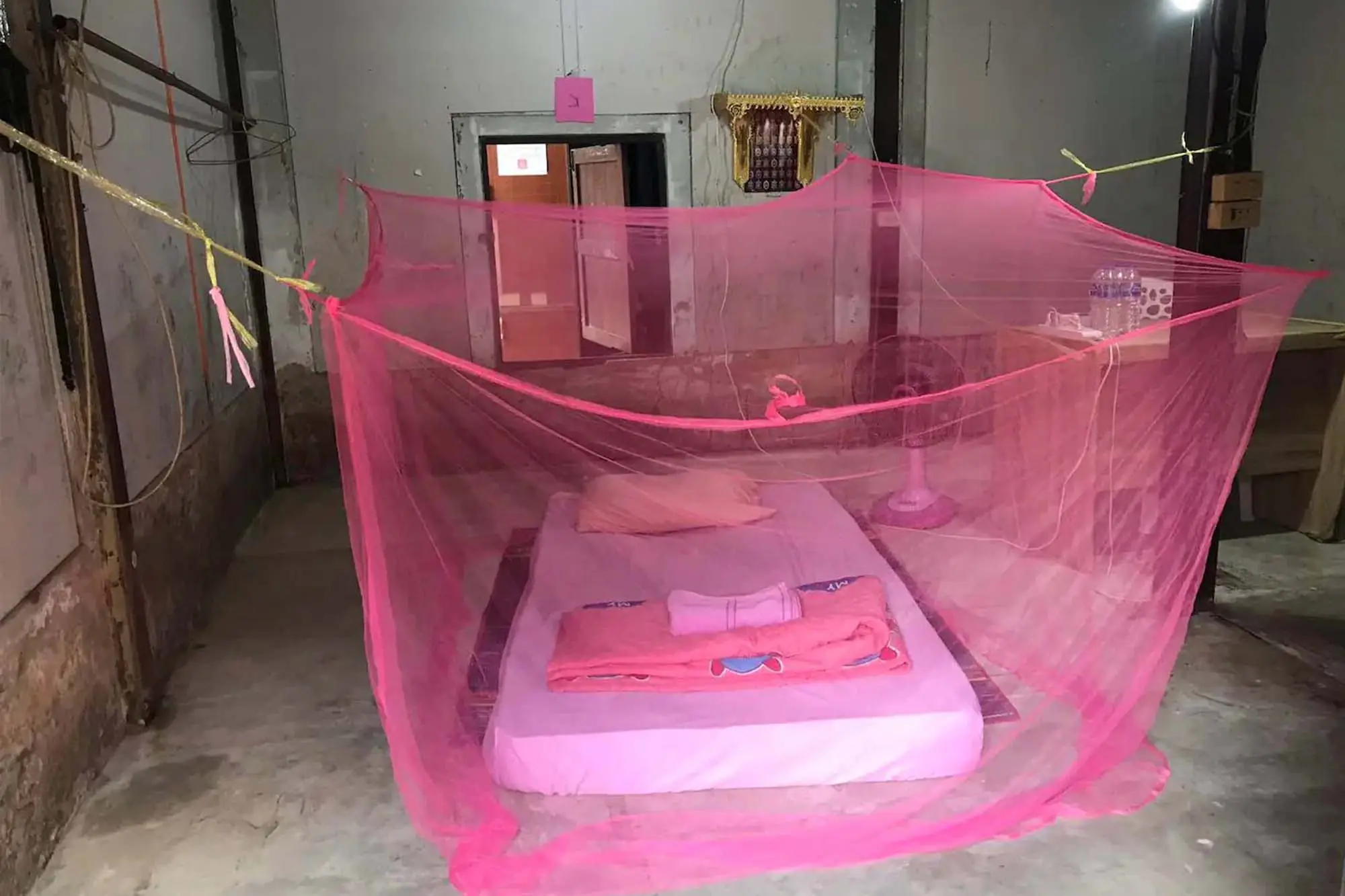 照片显示,房间里只有风扇,床铺平放在地板上,且配有简陋的蚊帐。