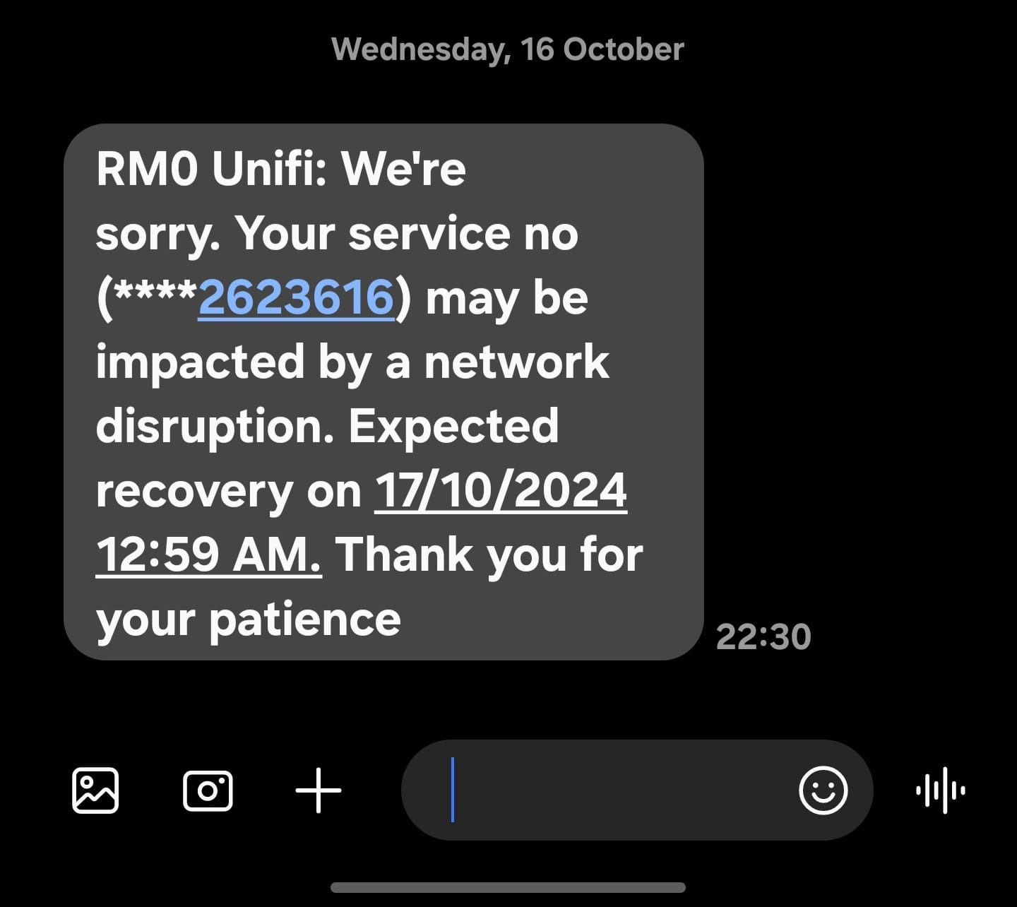 马电讯旗下Unifi宽频服务供应单位在臉書專頁通知,Unifi的工作人員正盡力恢復網絡服務,预计可以本 月 17日早上10時完成。