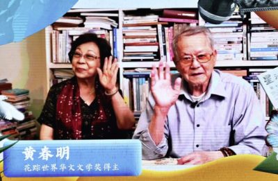 第12届花踪世界华文文学奖得主黄春明和妻子林美音,透过网络视讯,在台北家中和新山的花踪文学奖颁奖典礼现场连线、致词。
