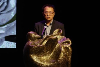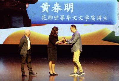 黄国珍代表父亲黄春明,从世华媒体集团董事主席张聪手中接过第12届花踪世界华文文学奖的铜雕奖座。左一为世华媒体(马)集团总编辑兼星洲日报总编辑郭清江。