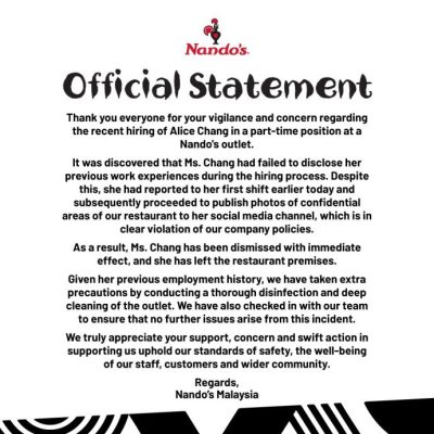 Nando’s今晚罕见的发布中文文告,指Alice Chang在面试时没有提供工作经历,但仍然在今天到SunwayPutra Mall分店上班。