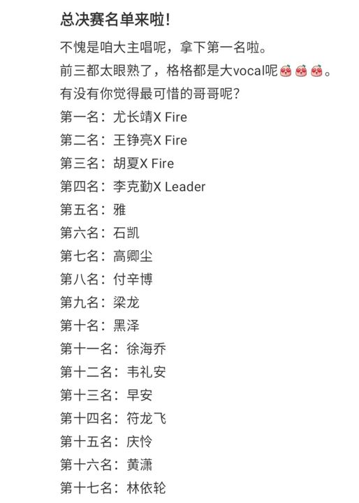 在《披荆斩棘4》总决赛,李克勤成功拿下X Leader,而尤长靖、胡夏和王铮亮皆被选为X Fire。而在17人的成团名单中,据传尤长靖拿下个人喜爱度第一名而成功出道,让“尤长靖总决赛第一”登上微博热搜。