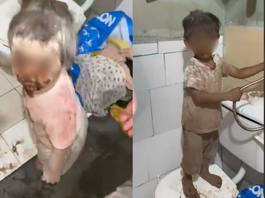 视频中,女子的厨房一片凌乱肮脏,满地都是可可粉,厨具掉满地,像极了灾难现场,而她的2名孩子全身都是可可粉,只能将他们带到厕所准备清洗。