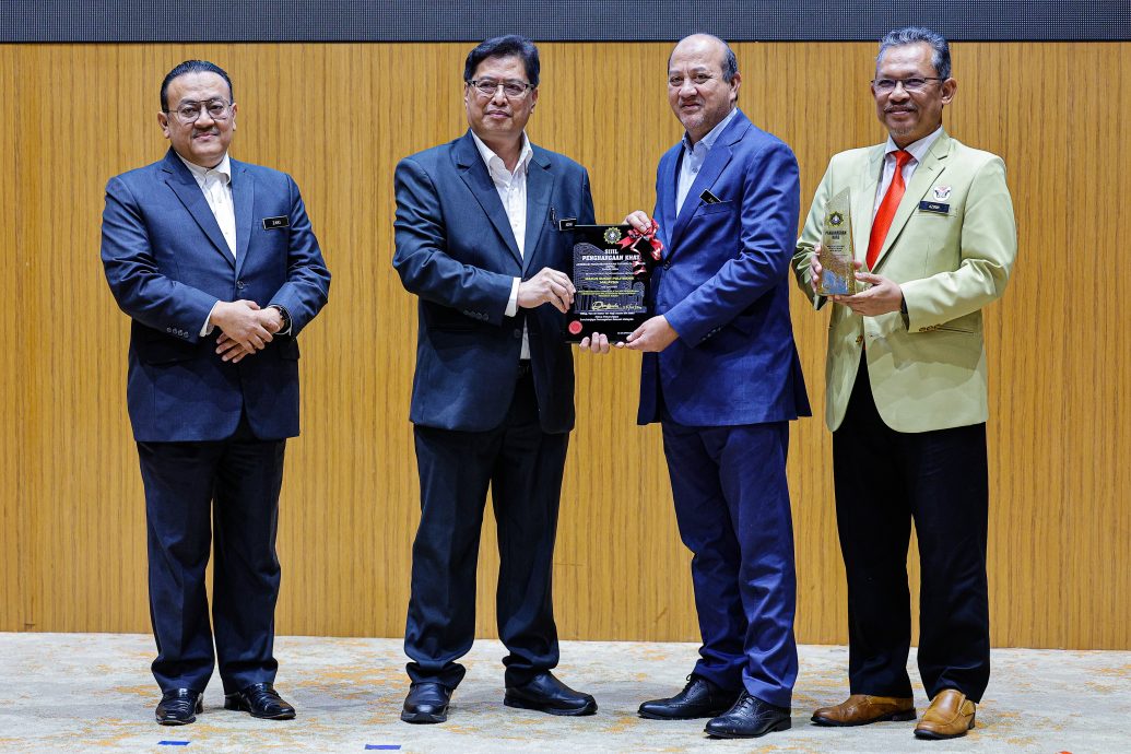 阿占巴基(左二)颁发州级别机构改善治理表扬状给教育局工艺学院及社区学院组主任拿督莫哈末扎哈里(右二)与工艺学院体育理事会主席阿兹林(右一)。左一是反贪会治理调查组主任拿督莫哈末查基。(马新社图)